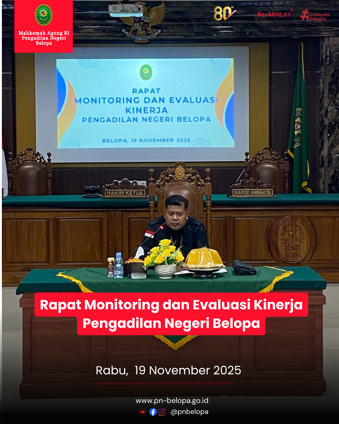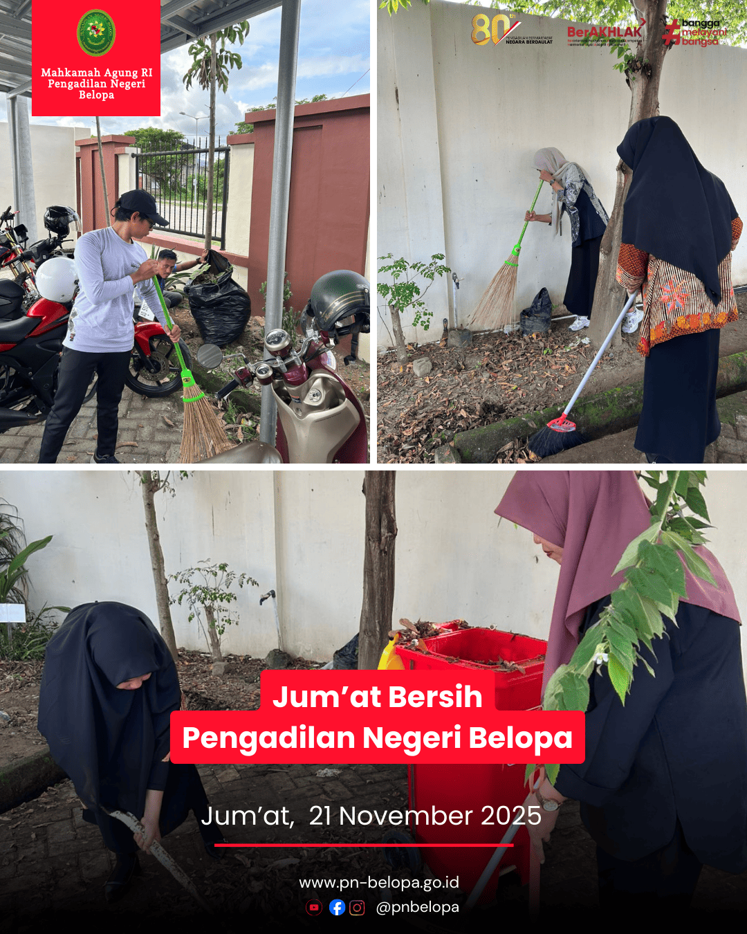 Pengadilan Negeri Belopa melaksanakan kegiatan Jum’at Bersih sebagai upaya menjaga kebersihan, kerapian, dan kenyamanan lingkungan kerja. Seluruh pegawai turut berpartisipasi dalam kegiatan ini dengan membersihkan area kantor, ruang pelayanan, serta lingkungan sekitar.